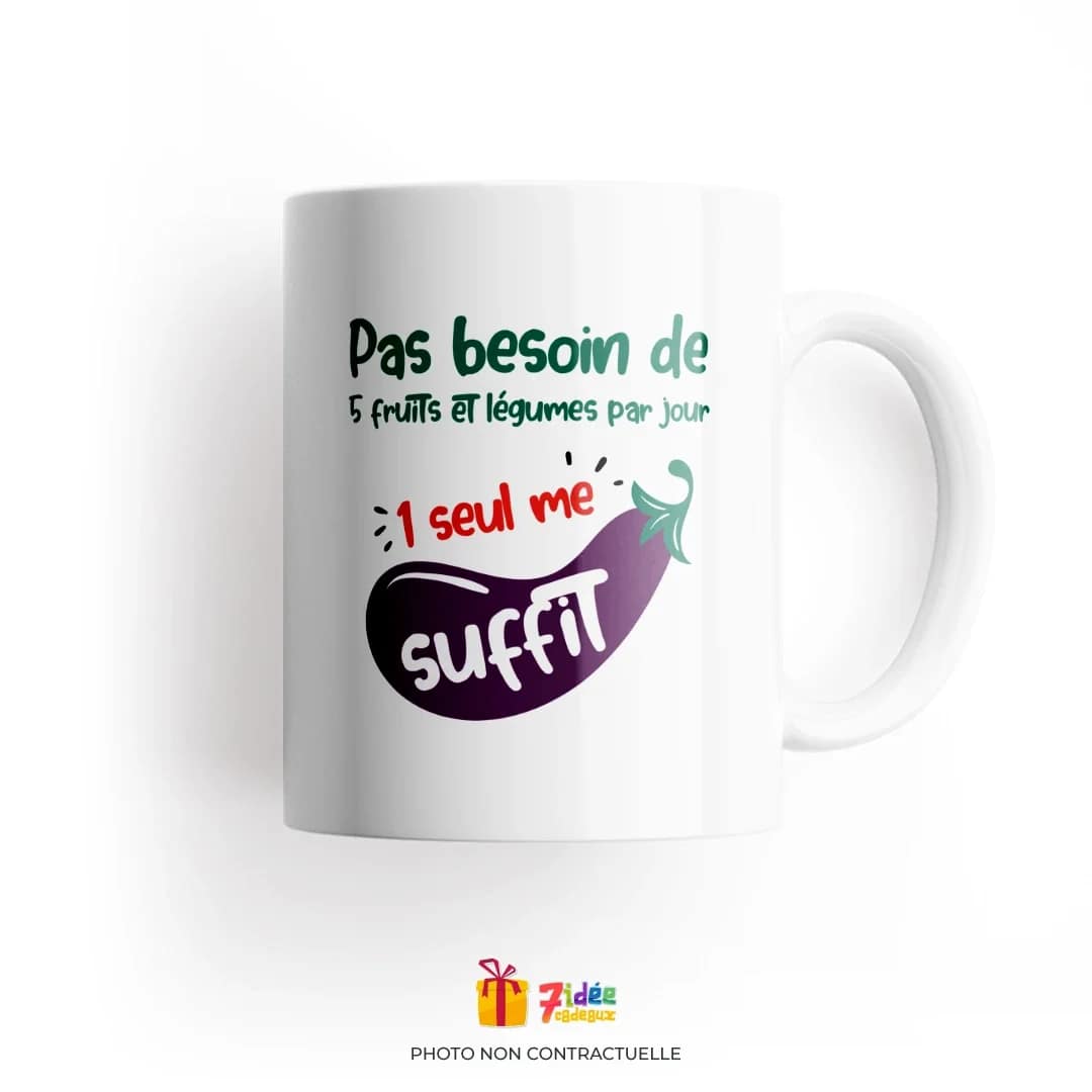 Avec son message provocateur « Pas besoin de 5 fruits et légumes par jour, 1 seul me suffit », ce mug est parfait pour ajouter une touche d’originalité à vos pauses café ou thé.